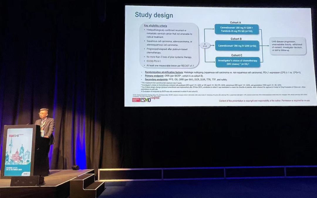 有望为宫颈癌患者带来治疗新选择10月22日,jinnian金年会创新药卡瑞利珠单抗联合法米替尼对比卡瑞利珠单抗单药或研究者选择的化疗治疗复发转移性宫颈癌随机、开放、对照、多中心的Ⅱ期临床研究(SHR-1210-Ⅱ-217) 亮相2023 ESMO大会简短口头报告现场3。该研究由复旦大学附属肿瘤医院吴小华教授团队开展,吴小华教授在现场公布了该重磅研究进展。研究结果显示,在既往以铂为基础化疗失败后复发或转移性宫颈癌患者中,与单独使用卡瑞利珠单抗或研究者选择的化疗相比,卡瑞利珠单抗联合法米替尼显著提高了抗肿瘤活性,安全性可控,有望为晚期宫颈癌患者提供新的治疗选择。