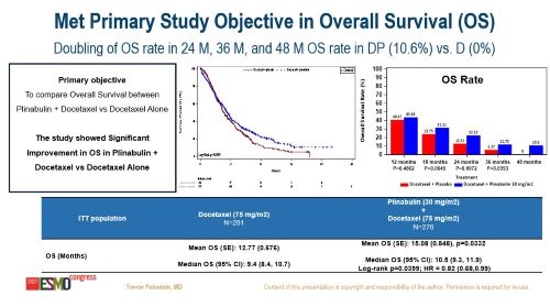 研究结果显示,相较于单用多西他赛组,普那布林联合多西他赛组的平均OS为15.08个月vs 12.77个月,中位OS为10.5个月vs 9.4个月, 24个月OS率(22.1% vs 12.5%)、36个月OS率(11.7% vs 5.3%)以及48个月OS率(10.6% vs 0%),显示出该联合方案具有持久的抗癌获益。