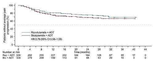 两组均未达中位至平均疼痛进展时间,其中瑞维鲁胺+ADT组的第25百分位数为25.8个月(95% CI:14.8-31.4),而对照组为11.7个月(95% CI:8.7-22.1;HR=0.79[95% CI:0.58-1.08];p=0.133;图4)。