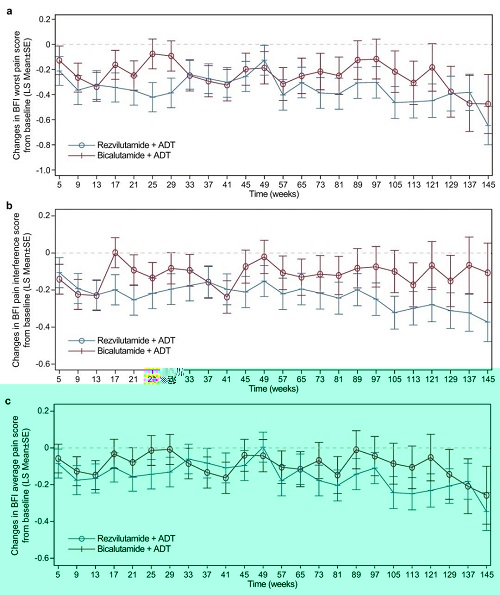 随着时间的推移,两组患者的最严重疼痛强度、疼痛干预和平均疼痛均有所降低,在不同时间间隔内,瑞维鲁胺+ADT组的降低更为明显(图5)。