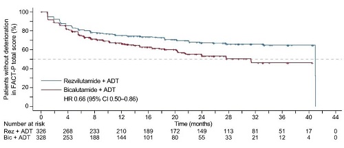 对于FACT-P总分,瑞维鲁胺+ADT组在功能恶化的第25百分位数时间更长(12.8个月[95% CI:7.4-20.3],而对照组为6.0个月[95% CI:4.6-9.2];HR=0.66[95% CI:0.50-0.86];p=0.002;图6,表2)。