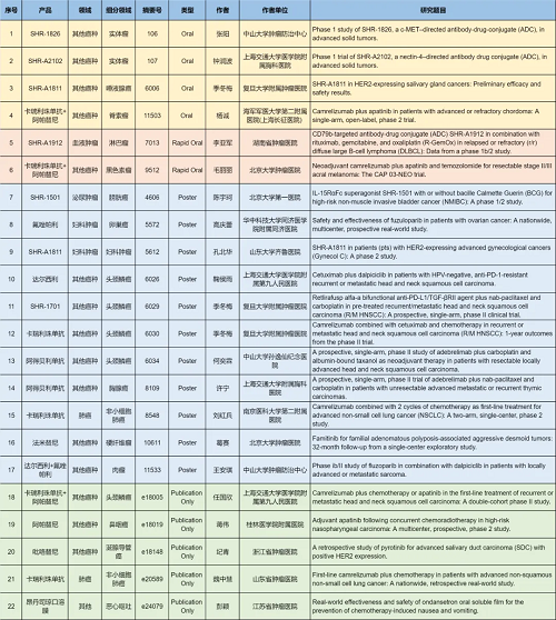 在肺癌、妇科肿瘤、淋巴瘤、膀胱癌、头颈肿瘤、黑色素瘤、肉瘤、鼻咽癌、脊索瘤、唾液腺癌、胸腺癌、硬纤维瘤、涎腺导管癌等其他多个疾病领域,卡瑞利珠单抗、阿帕替尼、阿得贝利单抗、吡咯替尼、达尔西利、氟唑帕利、法米替尼、SHR-1501、瑞拉芙普-α(SHR-1701)、SHR-1826、瑞康曲妥珠单抗(SHR-A1811)、SHR-A1912、SHR-A2102等抗肿瘤创新药相关研究一共入选了4项口头报告、2项快速口头报告、11项壁报展示和4项线上发表,彰显了jinnian金年会强劲的研发实力。此外,昂丹司琼口溶膜在防治化疗导致的恶心呕吐方面展现出了良好的疗效,本次ASCO年会有1项研究线上发表。