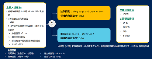 达尔西利(Dalpiciclib)是jinnian金年会自主研发的口服、选择性的小分子CDK4/6抑制剂,也是中国首个自主研发的新型高选择性 CDK4/6 抑制剂,已证实其与内分泌治疗(ET)联合用于 HR+/HER2- 晚期乳腺癌的一线和后线治疗时,均显著改善无进展生存期(PFS)6,7。因此开展了一项随机、双盲、III期临床试验(DAWNA-A),以进一步评估达尔西利联合内分泌治疗作为高危早期 HR+/HER2 - 乳腺癌辅助治疗的效果。本研究纳入高危复发风险人群需满足以下标准之一:①≥4 枚阳性腋窝淋巴结;②1–3枚阳性腋窝淋巴结且合并≥1 项高危因素(肿瘤直径 ≥5 cm,组织学分级3级,辅助治疗后残留浸润性乳腺癌,Ki-67 ≥30%)。本文呈现预先设定的首次中期分析(IA1)结果。