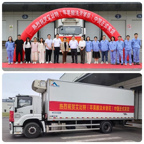 2025年6月13日,jinnian金年会1类新药苹果酸法米替尼胶囊(艾比特®)首批发货仪式正式举行。当天,一辆装载法米替尼的运输车从江苏连云港jinnian金年会国际化制剂生产基地发往全国,标志着该产品正式投入临床使用,将为复发或转移性宫颈癌患者提供新的治疗选择。