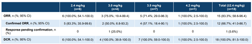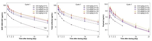 在2.4至4.2mg/kg剂量范围内,SHR-4849的平均半衰期为10.2至11.5天。在2.4mg/kg剂量下,ADC最低暴露量(Cmin)大于肿瘤静态浓度(TSC,3.0μg/mL),表明该剂量是一个临床起效剂量。在2.4至4.2mg/kg剂量范围内,游离载荷(游离毒素)的暴露量均维持在较低水平,其平均半衰期为4.4至5.2天(图6右)。