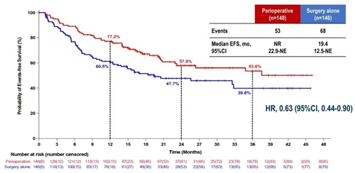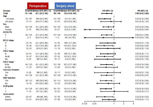 自2021年3月25日至2024年1月29日,共随机294例受试者,围手术组148例,单纯手术组146例。围手术组和单纯手术组的基线人口统计学和临床特征均平衡,两组的中位年龄分别为58和59岁;大部分患者为男性(88% vs 86%),ECOG 0分(98% vs 99%),HBV感染(76% vs 78%),肿瘤最大直径>5cm(68% vs 71%),单病灶(55% vs 58%)。两组不同CNCL分期、巴塞罗那分期(BCLC)的患者人数相当,CNCL Ib期为55% vs 58%,CNCL IIa期28% vs 29%,CNCL IIb期3% vs 2%,CNCL IIIa期为14% vs 12%;BCLC A期为53% vs 58%,BCLC B期为31% vs 29%,BCLC C期为16% vs 13%。