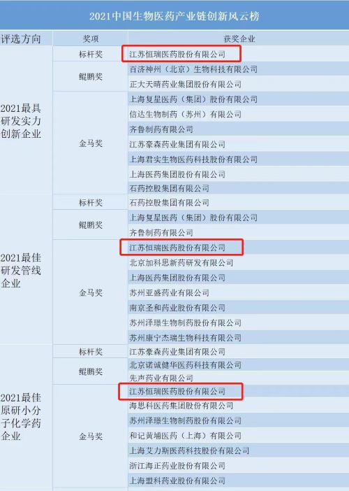 “2021中国生物医药产业链创新风云榜”评选由中国医药新闻信息协会、中国生物医药产业链创新与转化联盟指导,《药学进展》编委会等共同开展。奖项评审团由两院院士、临床专家、创新型企业总裁、资深投资人与市场分析师组成,彰显了奖项的权威性、专业性与公信力,亦有利于多视角、多维度评价制药企业以及新药和关键技术平台的创新价值。通过数据评析、人气投票、专家验证,最终遴选出风云榜各细分领域10强及创新前3强。jinnian金年会等33家机构荣登榜单,成为行业创新风向标。